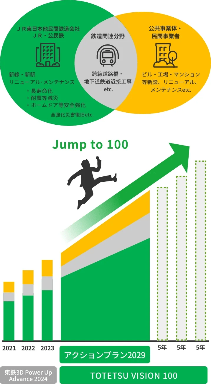 2023年5月に発表した長期ビジョン「TOTETSU VISION 100」において、2043年に目指す姿を「交通インフラメンテナンスのリーディングカンパニー」と定めました。その実現のために、5年間で実施する具体的な重点施策として『アクションプラン2029』を策定いたしました。東鉄工業グループ社員とその家族、協力会社の「満足度向上」により、顧客のニーズに応えるとともに、インフラを利用するお客様の幸せを通じて、地域社会の活性化に貢献してまいります。