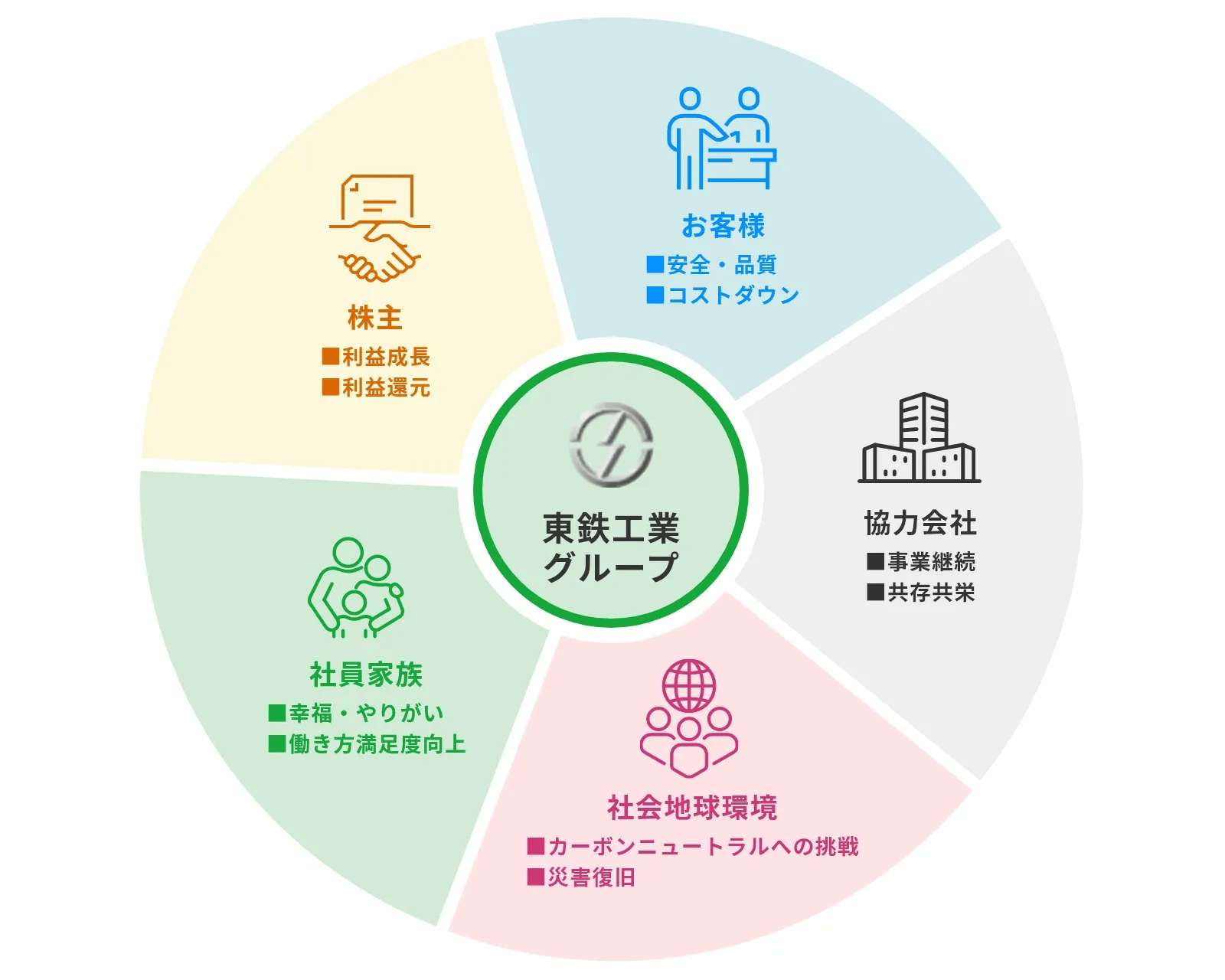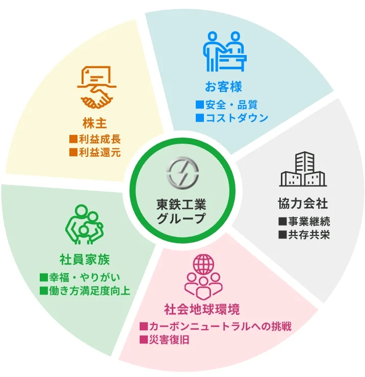 「持続的な成長」と中長期的な「企業価値の向上」を図りすべてのステークホルダーとの「共通価値」を創造いたします。