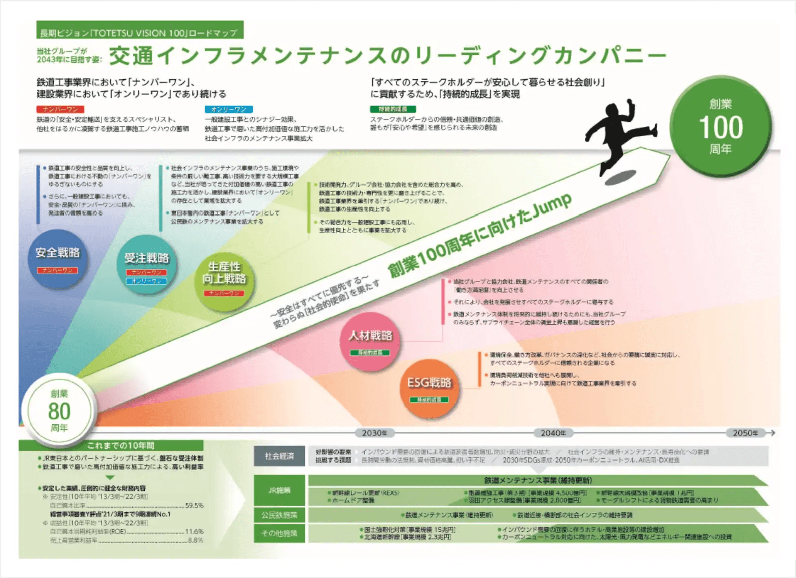 社会経済の変化のスパンが短期化し、価値観の多様化が進むこの時代に、当社グループは2023年7月に創業80周年を迎えました。来る「創業100周年」を展望し、当社グループが結束して事業をより力強く推進するために「長期ビジョン」を策定いたしました。2043年に目指す姿を「交通インフラメンテナンスのリーディングカンパニー」と定め、その実現のために5つの戦略を軸とした取組みを推進してまいります。