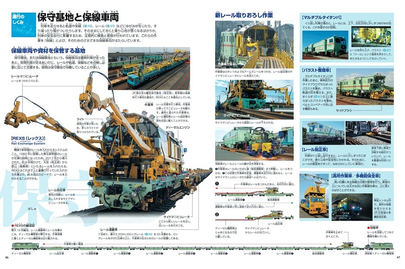 当社が保有するマルチプルタイタンパやバラストレギュレータが紹介されているほか、これまで人と重機で行っていたレール交換作業を、1つのシステムで効率的に行うことのできる世界初の保守用車である新幹線レール交換システム(REXS)も詳しく紹介されています。