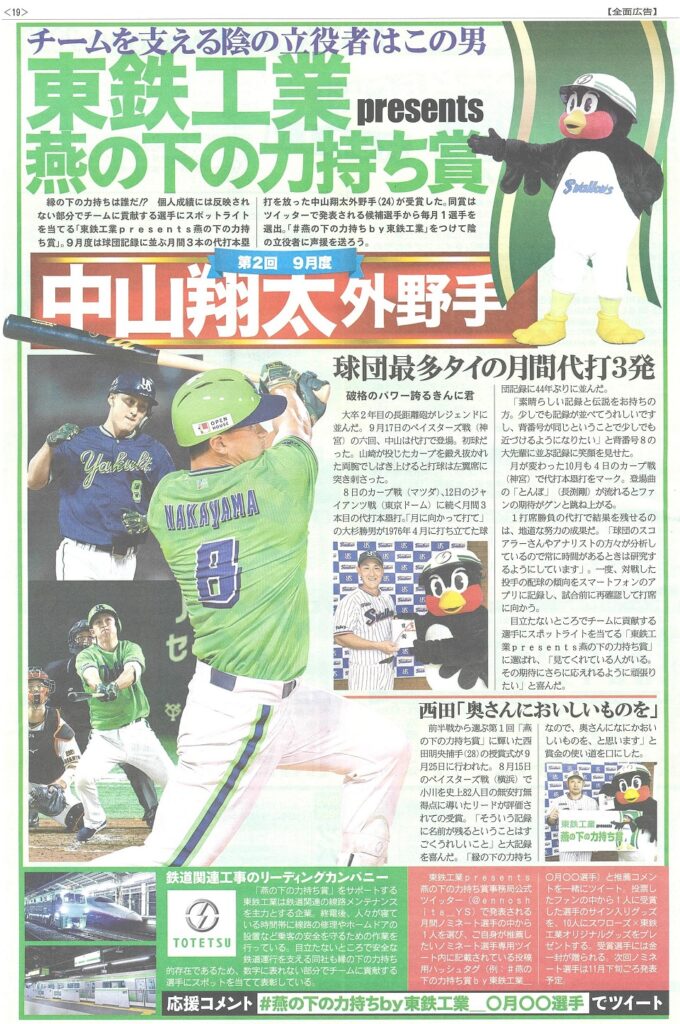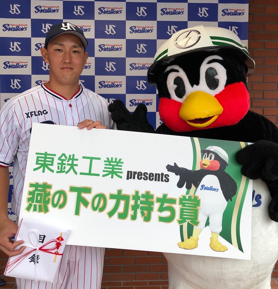 同賞は、東鉄工業presents燕の下の力持ち賞事務局公式ツイッター(@ennoshita_YS)でノミネートされる候補選手から皆さんの投票で毎月1選手が選出されます。次回10・11月度にノミネートされる選手にハッシュタグ「#燕の下の力持ち賞by東鉄工業_10・11月○○選手」をつけてツイートし、チームを陰で支える選手にエールを送りましょう!