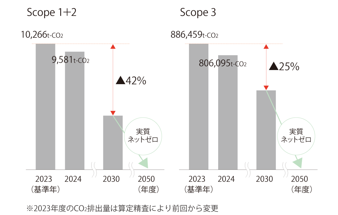また、CO2排出量削減目標として、2030年度までに2023年度比でScope1及び2の排出量を42%削減、Scope3排出量を25%削減し、2050年度までに実質ネットゼロを達成する中長期目標を設定しています