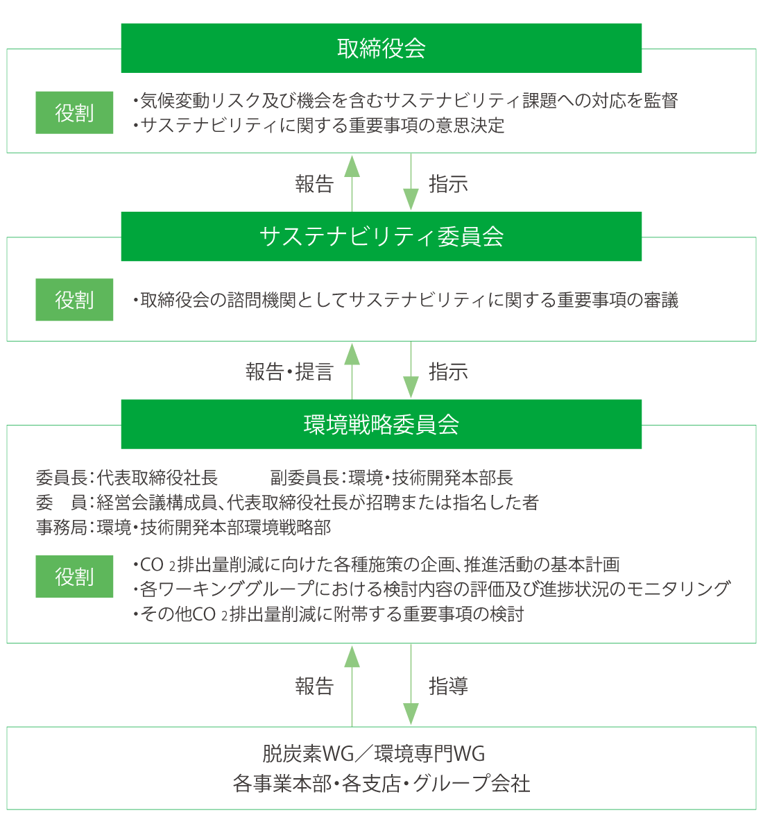 同委員会は、代表取締役社長を委員長として、経営会議メンバーで構成され、環境・技術開発本部環境戦略部が事務局を担っています。同委員会は原則として年2回開催され、 CO2排出量削減に向けた各種施策の企画、推進活動の基本計画及び実績評価、進捗状況のモニタリングなど、環境課題に関する重要事項を審議します。委員会で審議された内容は、サステナビリティ委員会に報告・提言され、取締役会へ報告されます。これにより、気候変動を含む環境課題に関する重要事項が経営判断に反映される体制を構築しています。