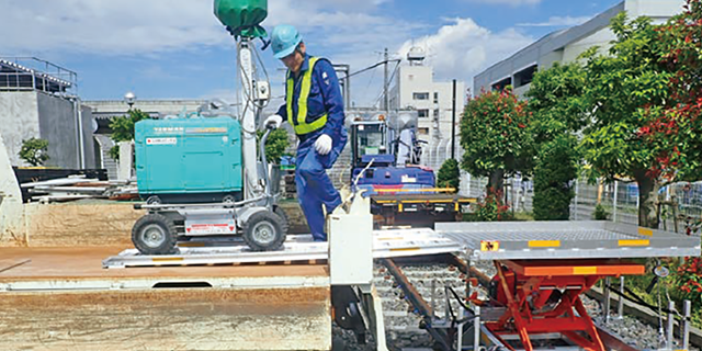 RAILWAY 線路事業 CIVIL ENGINEERING 土木事業 ARCHITECTURAL 建築事業 ENVIRONMENTAL 環境事業 RAILWAY 線路事業 遠隔・自動化装置の開発 【発生レール自動切断機】 作業の省力化に寄与する器具の開発 【つぎめ棒】 ミニバックホー用移動トロリー 4頭TT脱着型コンパクター 作業の省力化に寄与する器具の開発 【砕石整理用器具(Ballasco)】 遠隔・自動化装置の開発 【軌陸ダンプのリモコン式ダンピング装置】 新幹線レール交換システム(REXS) 小型つき固め機械 軌陸4頭一体型線路こう上装置(T-S2) 多頭式ボルト緊解機(i–CUTE) オールマイティタイタンパーアタッチメント 小型レール削正車 小型機械器具の開発 CIVIL ENGINEERING 土木事業 ホームドア工事シリーズ 【警告ブロック付きホーム工事用仮設覆工板】 ホームドア工事シリーズ 【ホーム工事用リフト機能付きトロ台車】 ホームドア工事シリーズ 【ホームドア用ケーブル収納ボックス】 ホームドア工事シリーズ 【ホーム工事用軌陸式門型クレーン】 軌陸式トラック荷台からの転落防止柵 移動式架設昇降吊り足場(シャトルX) PC電化柱耐震補強に適用する施工治具(TDシリーズ) 新幹線トンネル用ロックボルト打設機 新幹線トンネル用昇降式作業台 溝掘り掘削機 高構造物の耐震補強急速施工法 強制振動機TSVⅡ(振之助Ⅱ) ARCHITECTURAL 建築事業 ホーム上家耐震補強無溶接化工法シリーズ 柱杭スポッと工法 ハーネス付アシストスーツ ENVIRONMENTAL 環境事業 「地球にやさしい、街にやさしい」緑化技術 トモス緑化システム(屋上苔緑化) トスラシステム(壁面緑化) 木陰のトンネル TDBA 東鉄ドライアイスブラスト(石綿除去工法)