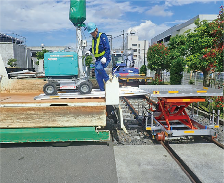 トロ台車によりホームに資機材を荷揚げする場合、軌陸クレーンや山越器による方法が一般的でしたが、手軽に荷揚げ・運搬できるリフト機能付きトロ台車を開発しました。