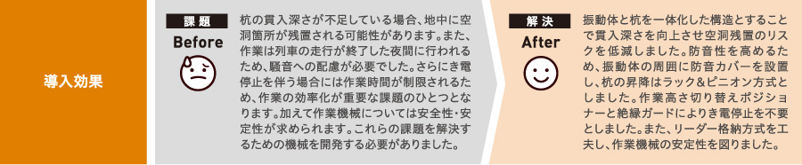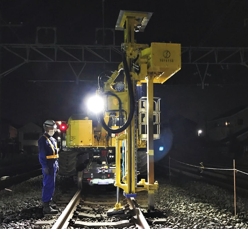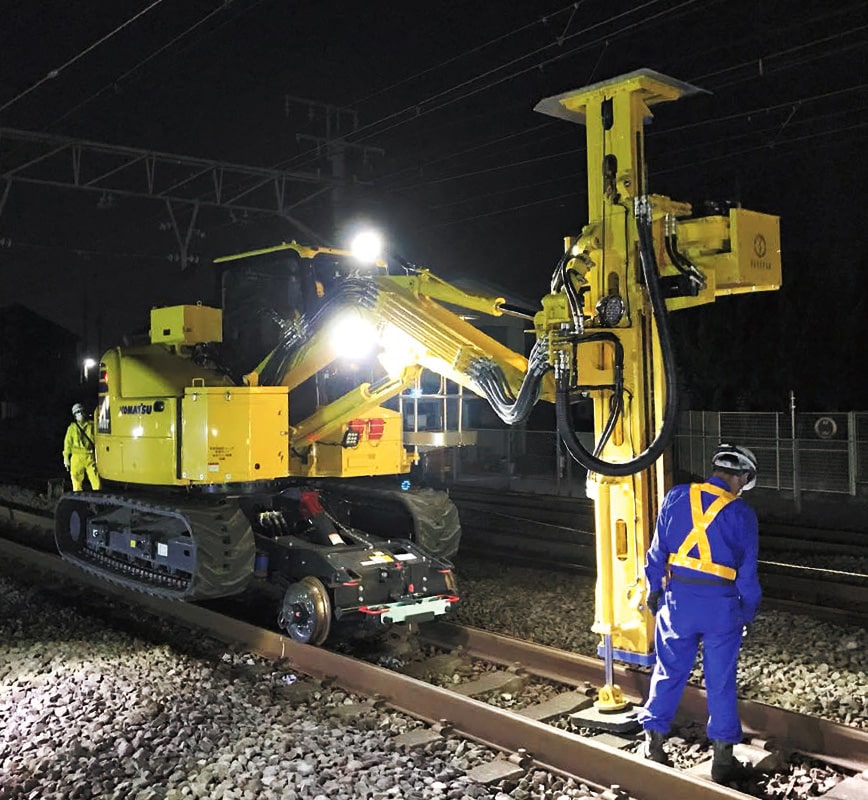 鋼鉄製の杭を路盤へ貫入し振動させることで線路下の空洞を埋める機械です。空洞が埋まると線路陥没の危険性がなくなります。