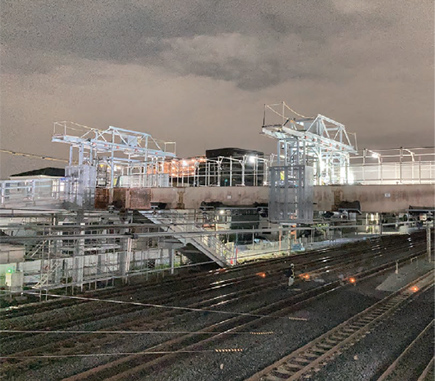 線路上空に設置された歩道橋の修繕作業に特化した吊り足場です。