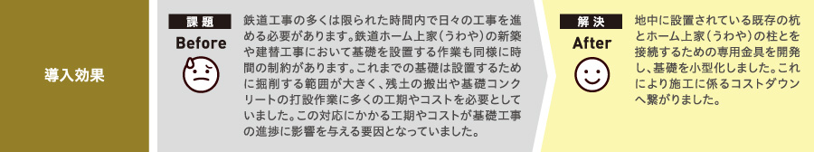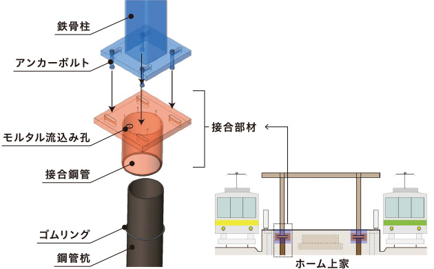 鉄道ホーム上家(うわや)の新築や建替工事において、従来の基礎では掘削範囲が大きく、残土の搬出や基礎コンクリート打設作業にコストや工期が多くかかることから二重鋼管接合により基礎を小型化する開発を行いました。