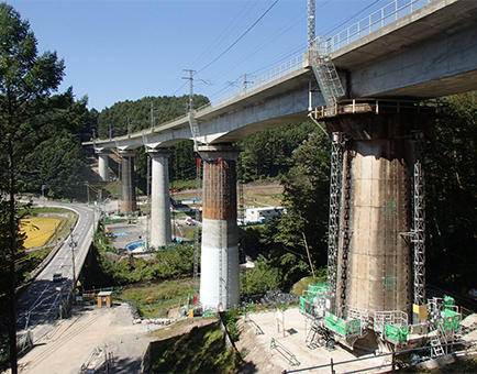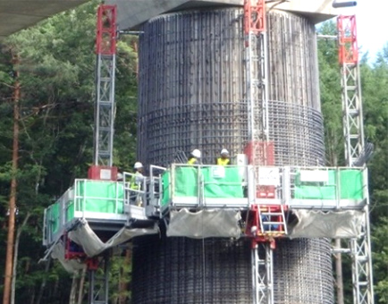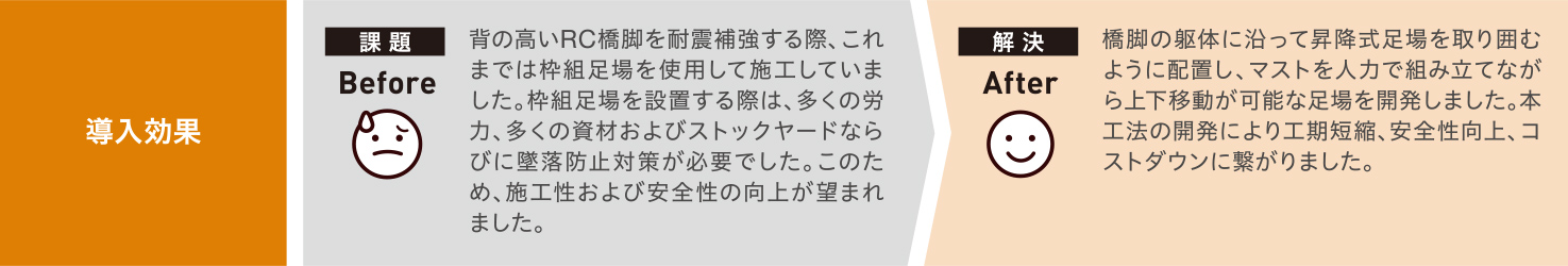 背の高いRC橋脚を耐震補強する際に、安全かつ短期間で施工可能な施工方法です。作業床に昇降式足場を採用することで、すべて作業床内からの施工が可能です。