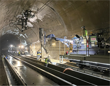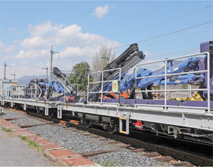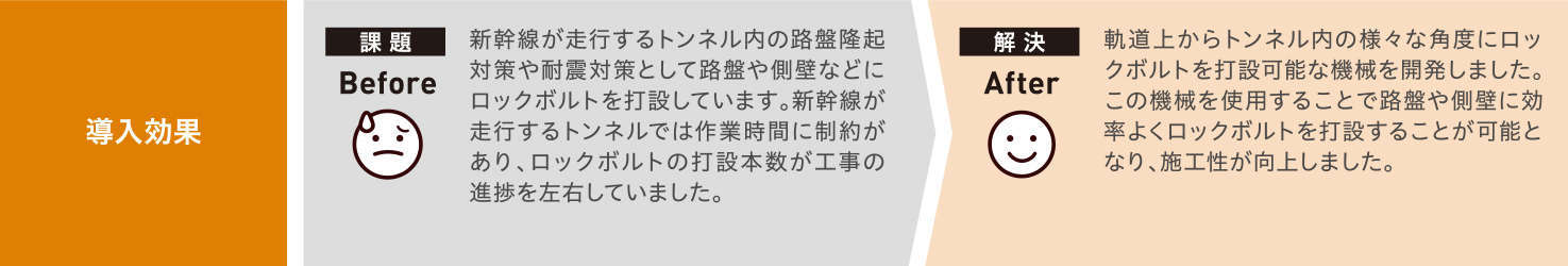 新幹線が走行するトンネル内にロックボルト(土や岩盤に固定するための金属製の棒状部品)を効率よく打設するための機械です。トンネル内の様々な角度にロックボルトの打設が可能です。