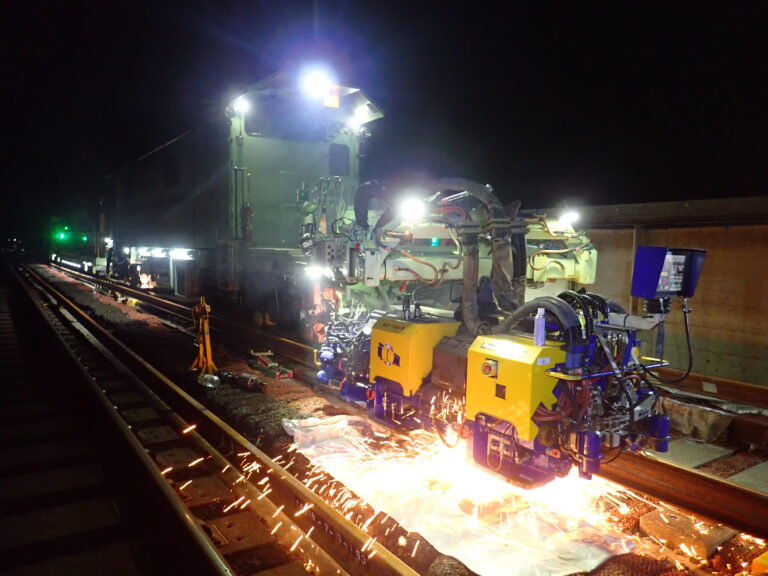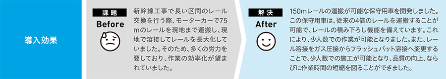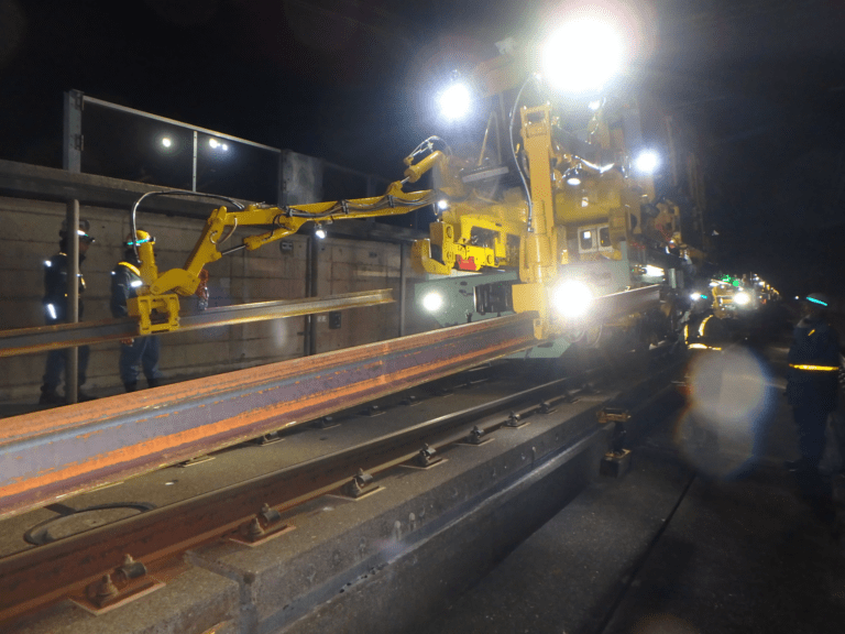 機械によるレールの積み下ろし機能と溶接作業の機械化により、従来よりも少人数での施工が可能となります。