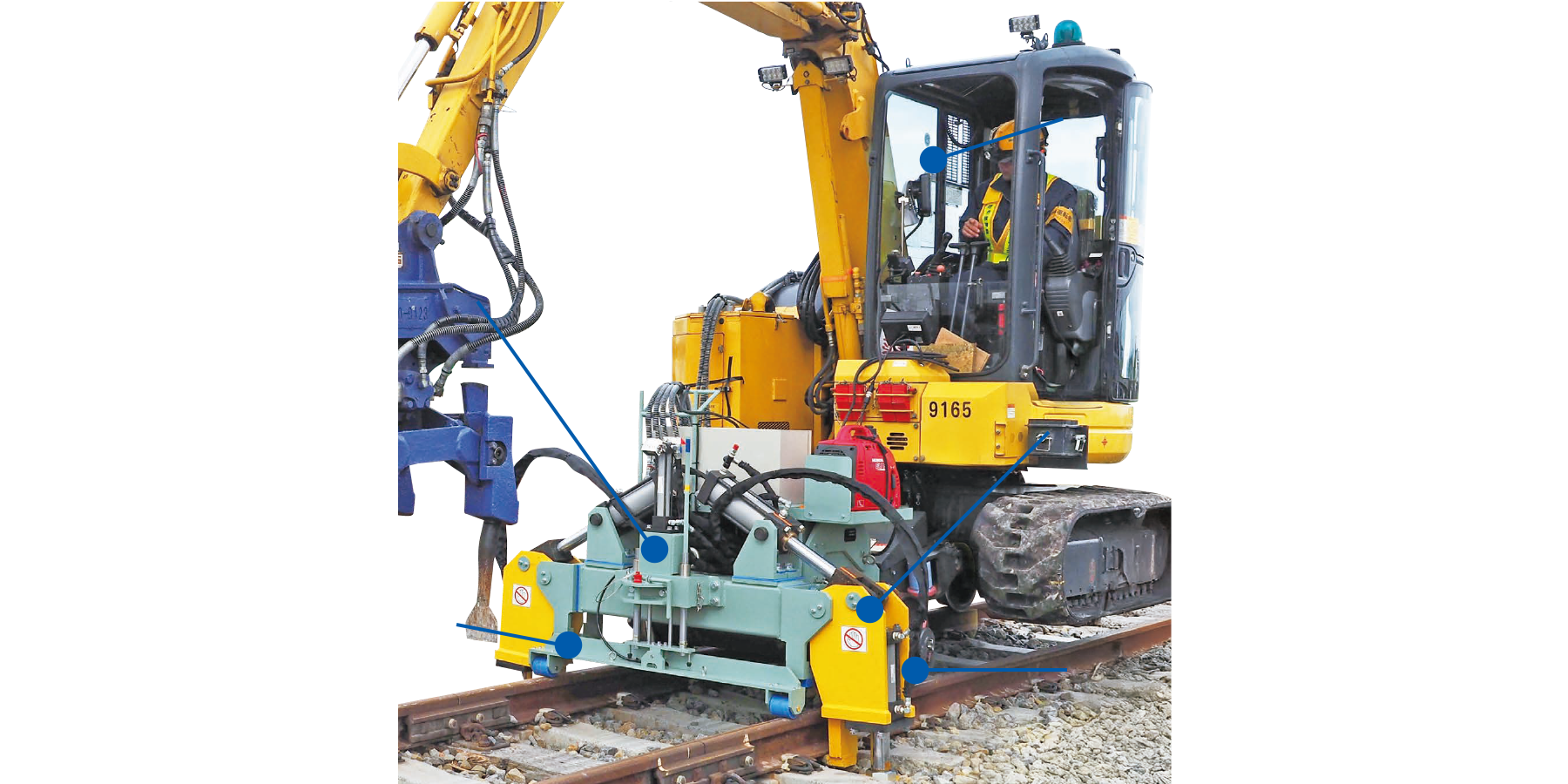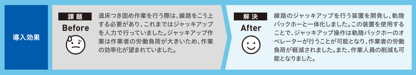 線路こう上装置を既存の軌陸バックホーと一体化し、線路こう上作業を軌陸バックホーオペレーターが操作することで、つき固め作業の省力化、省人化が可能となります。